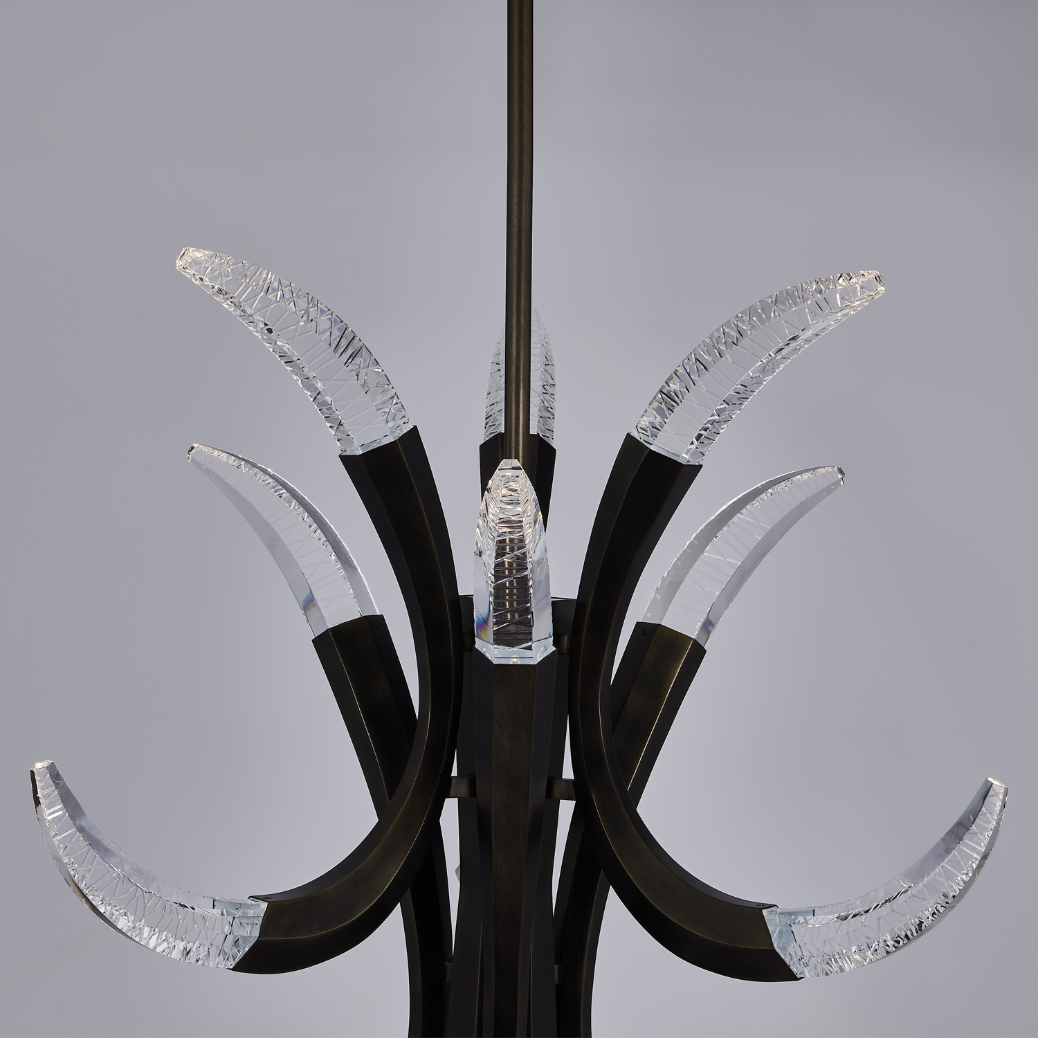 Drawing inspiration from antlers, the Corna Collection presents a sleek and artistic take on the traditional chandelier, incorporating distinctive crystals and advanced LED technology. The design boasts a hexagonal
