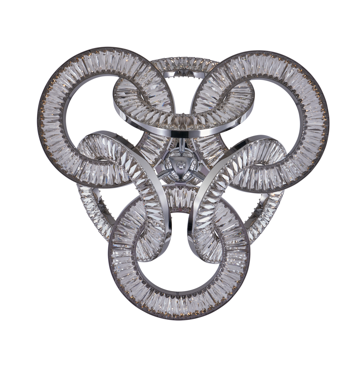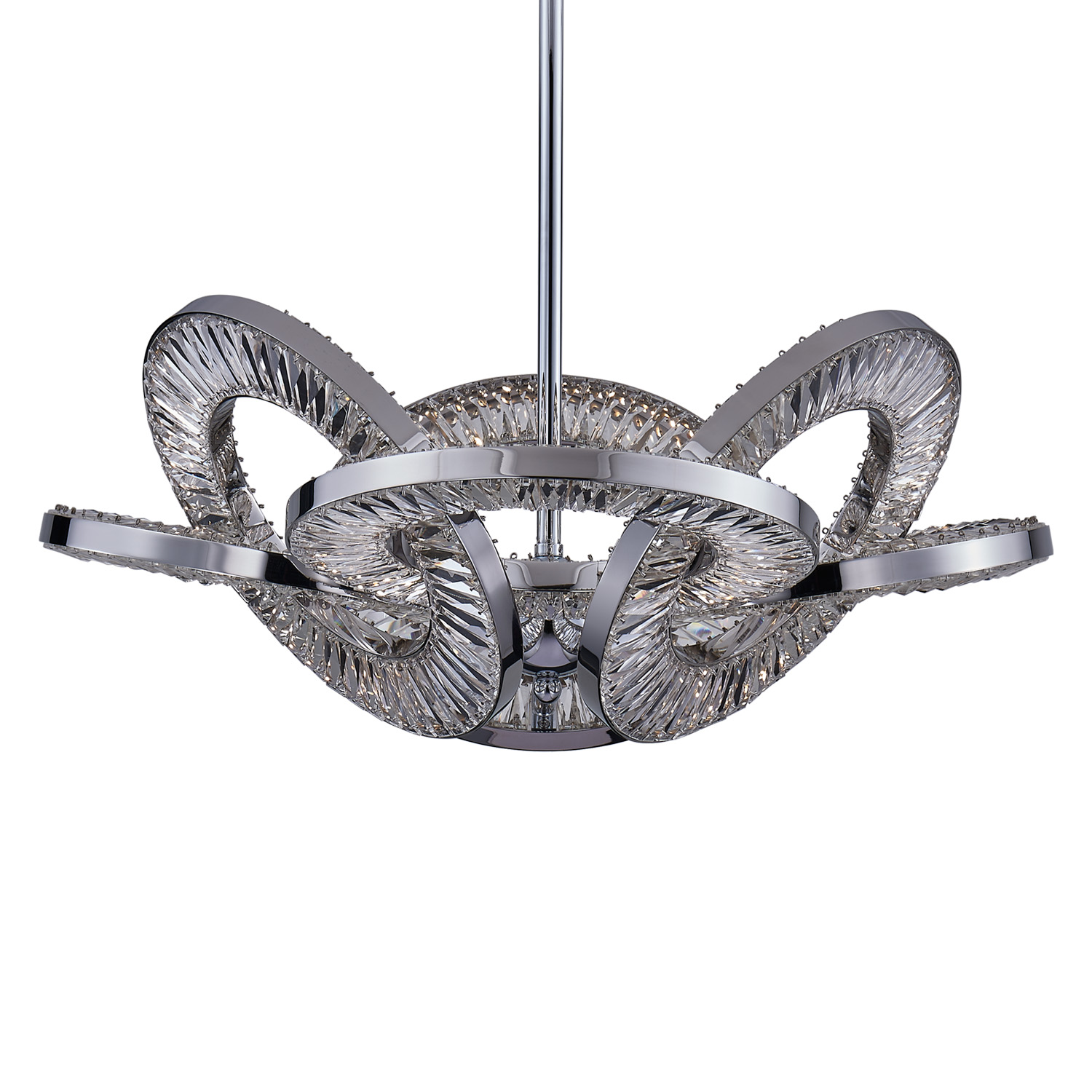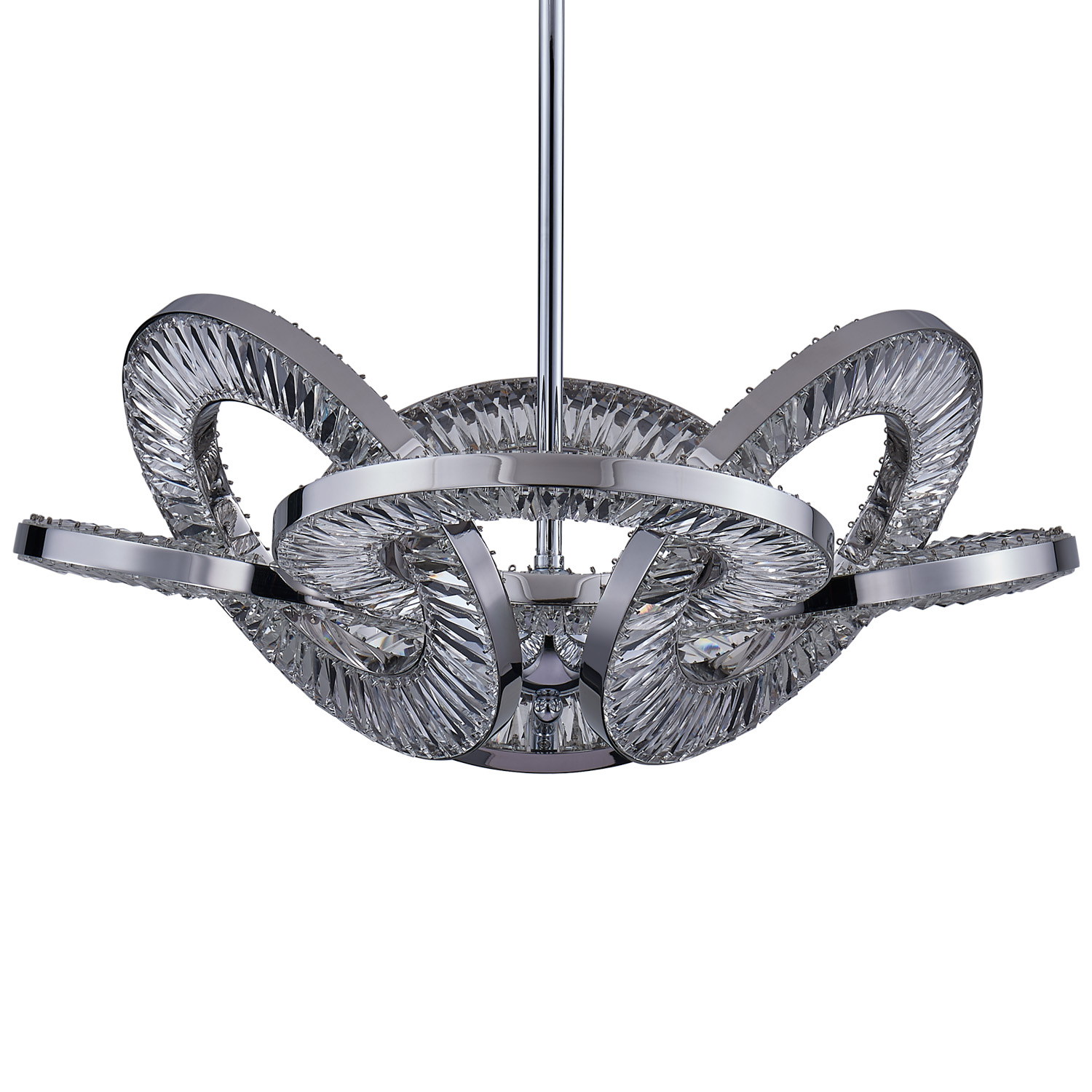 The Rotondo Collection of Crystal Lighting Pendants draws inspiration from intricate Celtic knots and elegant geometric patterns. This contemporary design showcases a triangular form composed of interlocking circles when viewed from beneath the fixture. It boasts concealed LED technology that allows for customizable color temperatures ranging from 2700k to 4000k, ensuring versatility. The dazzling crystal takes center stage, available in either a sleek Polished Chrome or a sophisticated Winter Brass finish.